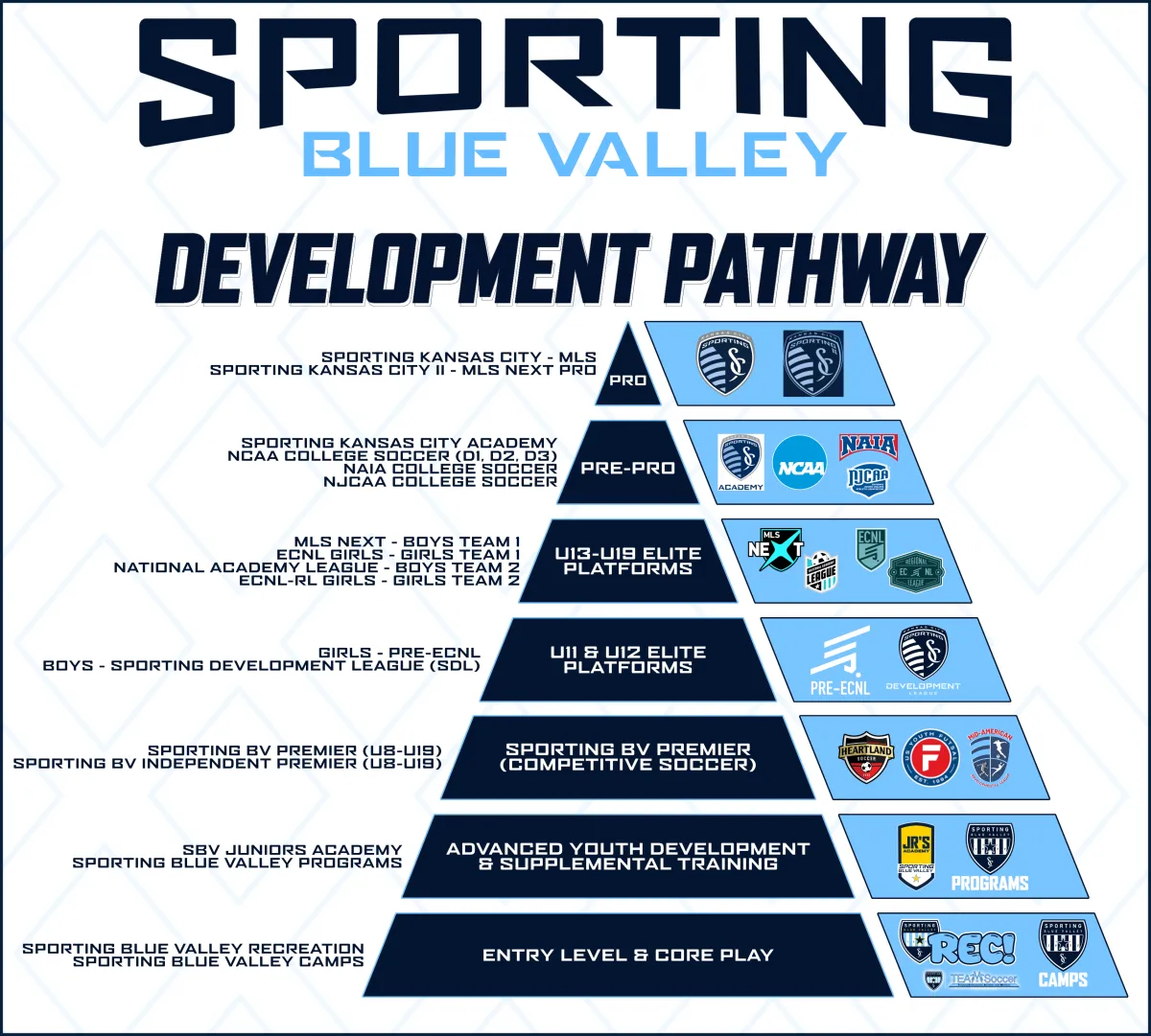 As the largest club in Kansas, Sporting Blue Valley creates a seamless pathway for player growth, offering a robust Recreational Program alongside a tiered Premier Program that includes participation in the Heartland Soccer Association, Pre-ECNL Girls, MADL Girls, ECNL-RL Girls, ECNL Girls, Sporting Development League, National Academy League, and MLS NEXT.